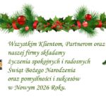 Wszystkim Klientom, Partnerom oraz Sympatykom naszej firmy składamy życzenia spokojnych i radosnych Świąt Bożego Narodzenia oraz pomyślności i sukcesów w Nowym 2026 Roku.